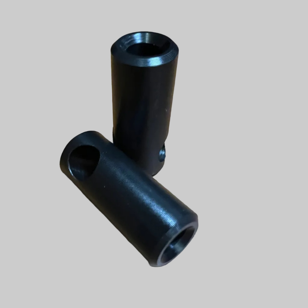CNC machined in house by Eric out of tough black acetal plastic. Shaft hole size is 11/32" to accommodate all standard sling shafts, and band hole size is .4" to give a snug fit on most standard sizes of rubber.